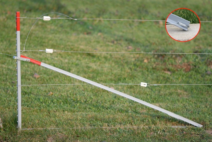 2.Tie one end of the brace wire off at the bottom of set post. While holding the brace post as far up and against the set post as possible, wrap the brace wire around the thimble, back to the set post, and tie off so that both sides have equal tension.